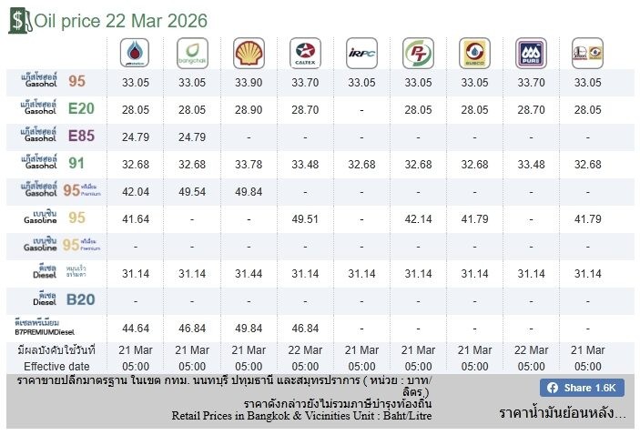 ราคาน้ำมันวันนี้ 22 มีนาคม 2569