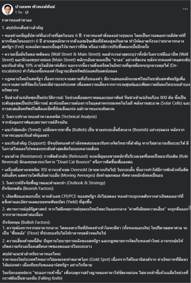 วันที่ 22 มีนาคม 2569 อ.ปานเทพ พัวพงษ์พันธ์ ได้โพสต์ข้อความผ่านเฟซบุ๊ก ปานเทพ พัวพงษ์พันธ์ แสดงความคิดเห็นเกี่ยวกับทิศทางราคาทองคำ โดยระบุว่าราคาทองคำกำลังเข้าสู่ภาวะขาลง พร้อมสรุปปัจจัยสำคัญ วิเคราะห์ทางเทคนิค และให้คำแนะนำด้านการลงทุนแก่ผู้ติดตาม