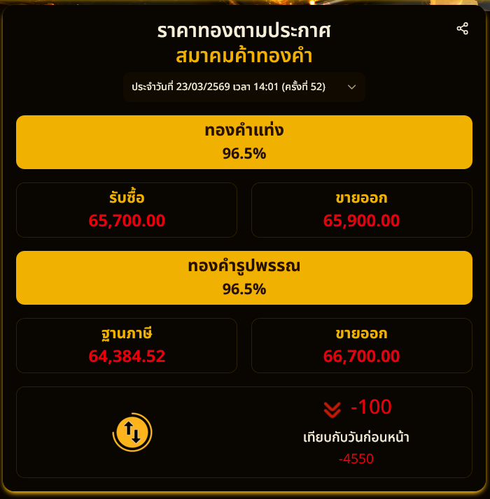 ราคาทองคำตลาดบ่ายวันนี้ 23 มีนาคม 2569 หลังเช้านี้ สมาคมค้าทองคำ ประกาศราคาทองครั้งที่ 1 (เปิดตลาด) เมื่อเวลา 09.00 น. ปรับตัวลงหนักต่อเนื่องอีก 1,850 บาท สู่บริเวณ 68,600 บาท