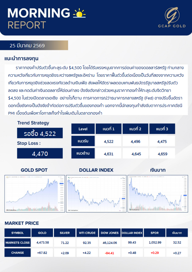 เเนะนำการลงทุนด้านทองคำ รอบเช้าวันนี้ 25 มีนาคม 2569 โดย บริษัท จีแคป จำกัด ราคาทองคำปรับตัวขึ้นทะลุระดับ $4,500 โดยโด้รับแรงหนุนจากการอ่อนค่าของดอลลาร์สหรัฐ ท่ามกลางความหวังเกี่ยวกับการหยุดยิงระหว่างสหรัฐและอิหร่าน โดยราคาฟื้นตัวขึ้นต่อเนื่องเป็นวันที่สองจากความหวังเกี่ยวกับการหยุดยิงช่วยลดแรงกังวลด้านเงินเฟ้อ ส่งผลให้อัตราผลตอบแทนพันธบัตรรัฐบาลสหรัฐปรับตัวลดลง และกดดันค่าเงินดอลลาร์ให้อ่อนค่าลง ปัจจัยดังกล่าวช่วยหนุนราคาทองคำให้ทะลุระดับจิตวิทยา $4,500 ในช่วงเปิดตลาดเอเชีย