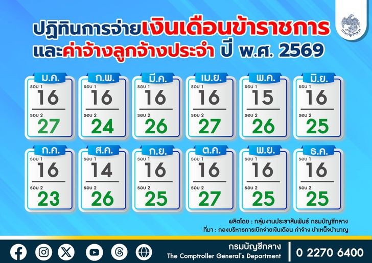 สำหรับในเดือนเมษายน 2569 เงินเดือนข้าราชการจะถูกโอนเข้าบัญชีวันที่ 16 และ 27 เมษายน 2569