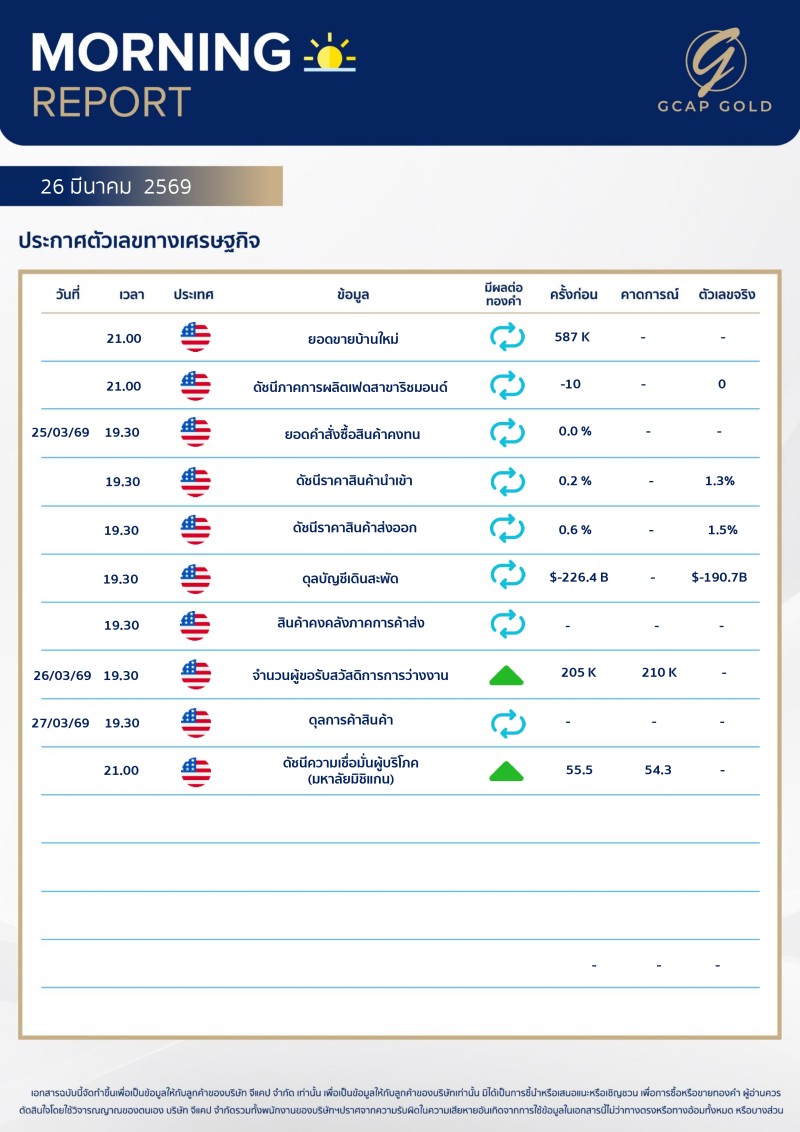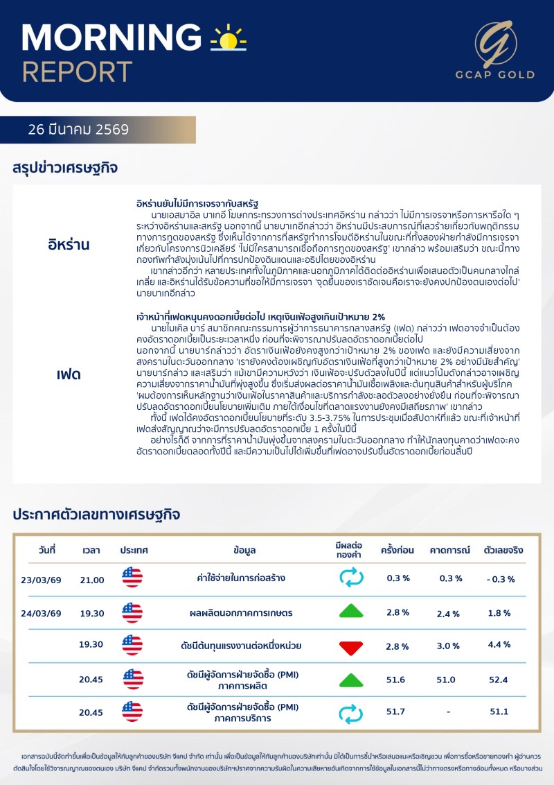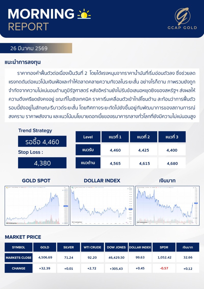เเนะนำการลงทุนด้านทองคำ รอบเช้าวันนี้ 26 มีนาคม 2569 โดย บริษัท จีแคป จำกัด ราคาทองคำฟื้นตัวต่อเนื่องเป็นวันที่ 2 โดยได้แรงหนุนจากราคาน้ำมันที่เริ่มอ่อนตัวลง ซึ่งช่วยลดแรงกดดันต่อแนวโน้มเงินเฟ้อและทำให้ตลาดคลายความกังวลในระยะสั้น อย่างไรก็ตาม ภาพรวมยังถูกจำกัดจากความไม่แน่นอนด้านภูมิรัฐศาสตร์ หลังอิหร่านยังไม่รับข้อเสนอหยุดยิงของสหรัฐฯ ส่งผลให้ความตึงเครียดยังคงอยู่