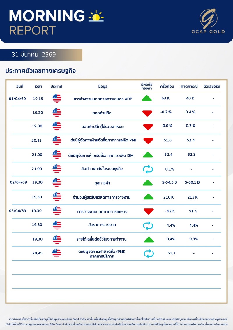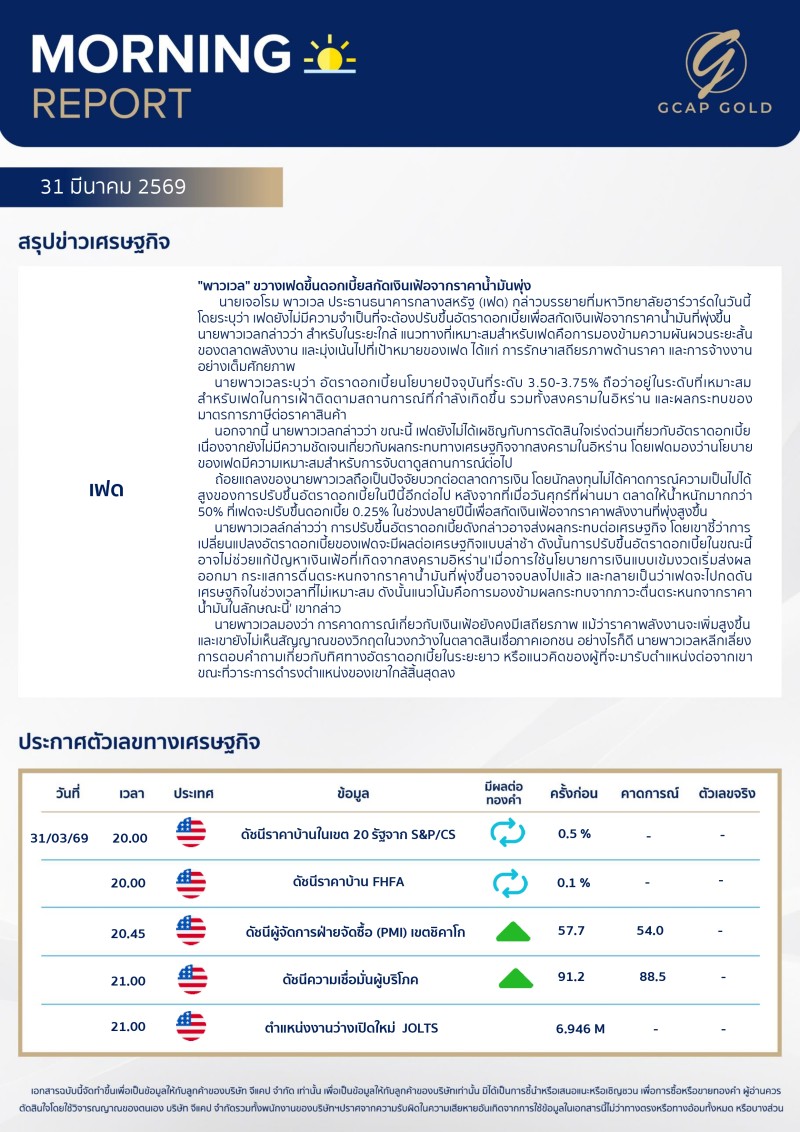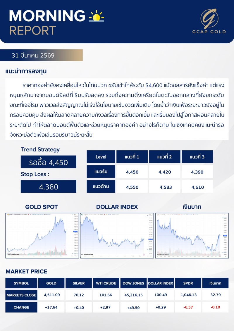 เเนะนำการลงทุนด้านทองคำ รอบเช้าวันนี้ 31 มีนาคม 2569 โดย บริษัท จีแคป จำกัด ราคาทองคำยังคงเคลื่อนไหวในโทนบวก ขยับเข้าใกล้ระดับ $4,600 แม้ดอลลาร์ยังแข็งค่า แต่แรงหนุนหลักมาจากบอนด์ยี่ลด์ที่เริ่มปรับลดลง รวมถึงความตึงเครียดในตะวันออกกลางที่ยังยกระดับ ขณะที่เจอโรม พาวเวลส่งสัญญาณไม่เร่งใช้นโยบายเข้มงวดเพิ่มเติม โดยย้ำว่าเงินเฟ้อระยะยาวยังอยู่ในกรอบควบคุม ส่งผลให้ตลาดคลายความกังวลเรื่องการขึ้นดอกเบี้ย และเริ่มมองไปสู่โอกาสผ่อนคลายในระยะถัดไป ทำให้ตลาดบอนด์ฟื้นตัวและช่วยหนุนราคาทองคำ อย่างไรก็ตาม ในเชิงเทคนิคยังแนะนำรอจังหวะย่อตัวเพื่อเล่นรอบรีบาวน์ระยะสั้น