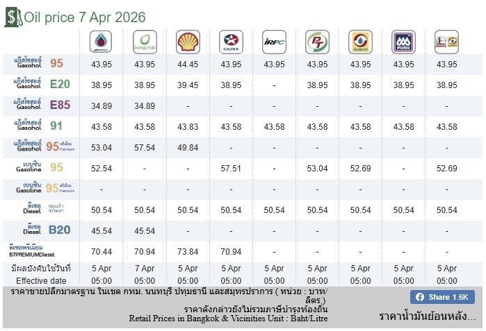 วันที่ 7 เม.ย.2569 สำนักงานนโยบายและแผนพลังงาน (สนพ.) กระทรวงพลังงาน มีการรายงานสถานการณ์ ราคาน้ำมันวันนี้ สถานีบริการน้ำมัน ได้แก่ ปตท. , บางจาก , PT , คาลเท็กซ์ , เชลล์ ราคาน้ำมันวันนี้ อัปเดตล่าสุด 5 สถานีบริการน้ำมัน