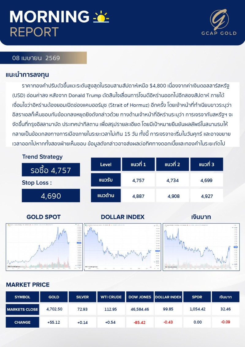 เเนะนำการลงทุนด้านทองคำ รอบเช้าวันนี้ 8 เมษายน 2569 โดย บริษัท จีแคป จำกัด ราคาทองคำปรับตัวขึ้นแตะระดับสูงสุดในรอบสามสัปดาห์เหนือ $4,800 เนื่องจากค่าเงินดอลลาร์สหรัฐ (USD) อ่อนค่าลง หลังจาก Donald Trump ตัดสินใจเลื่อนการโจมตีอิหร่านออกไปอีกสองสัปดาห์