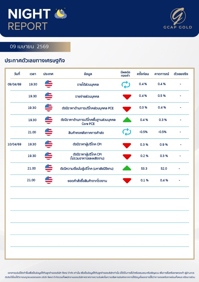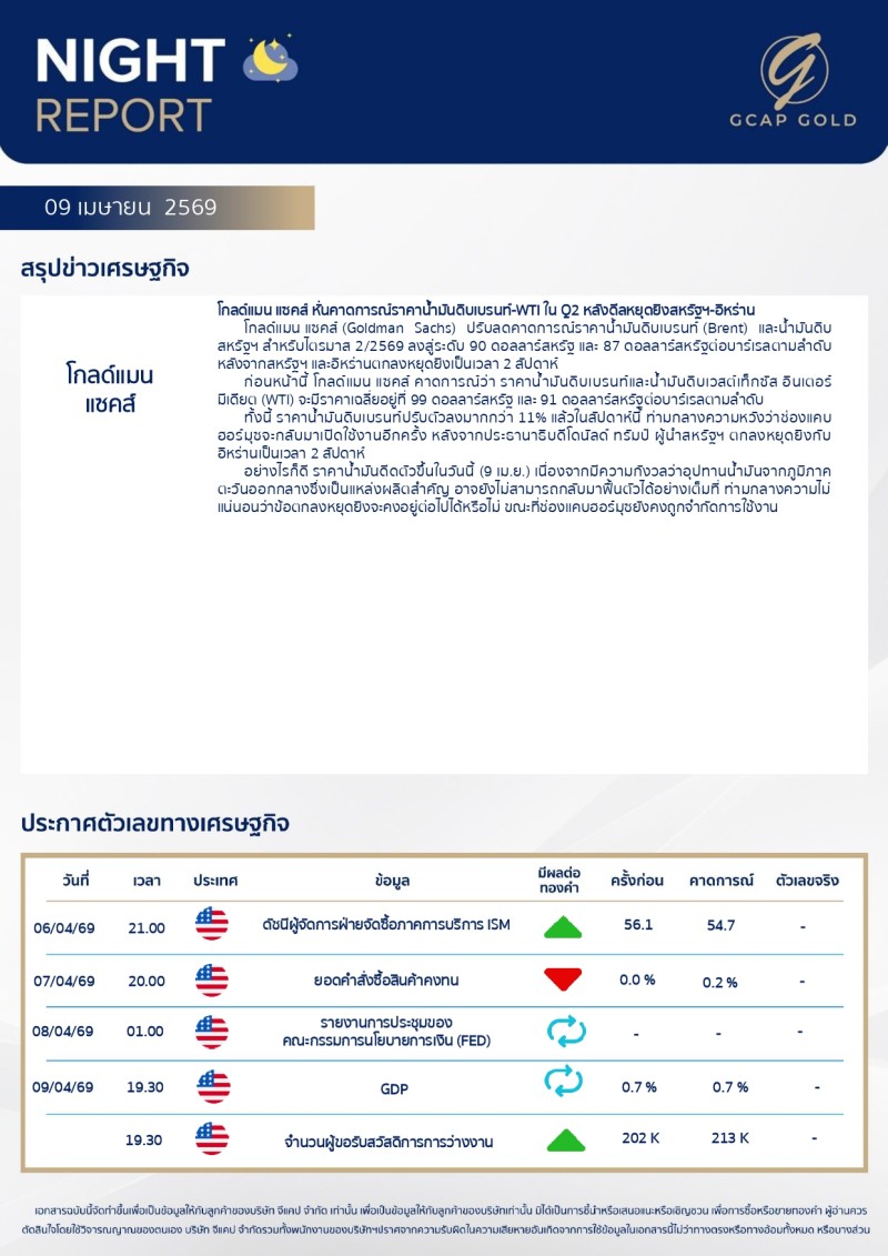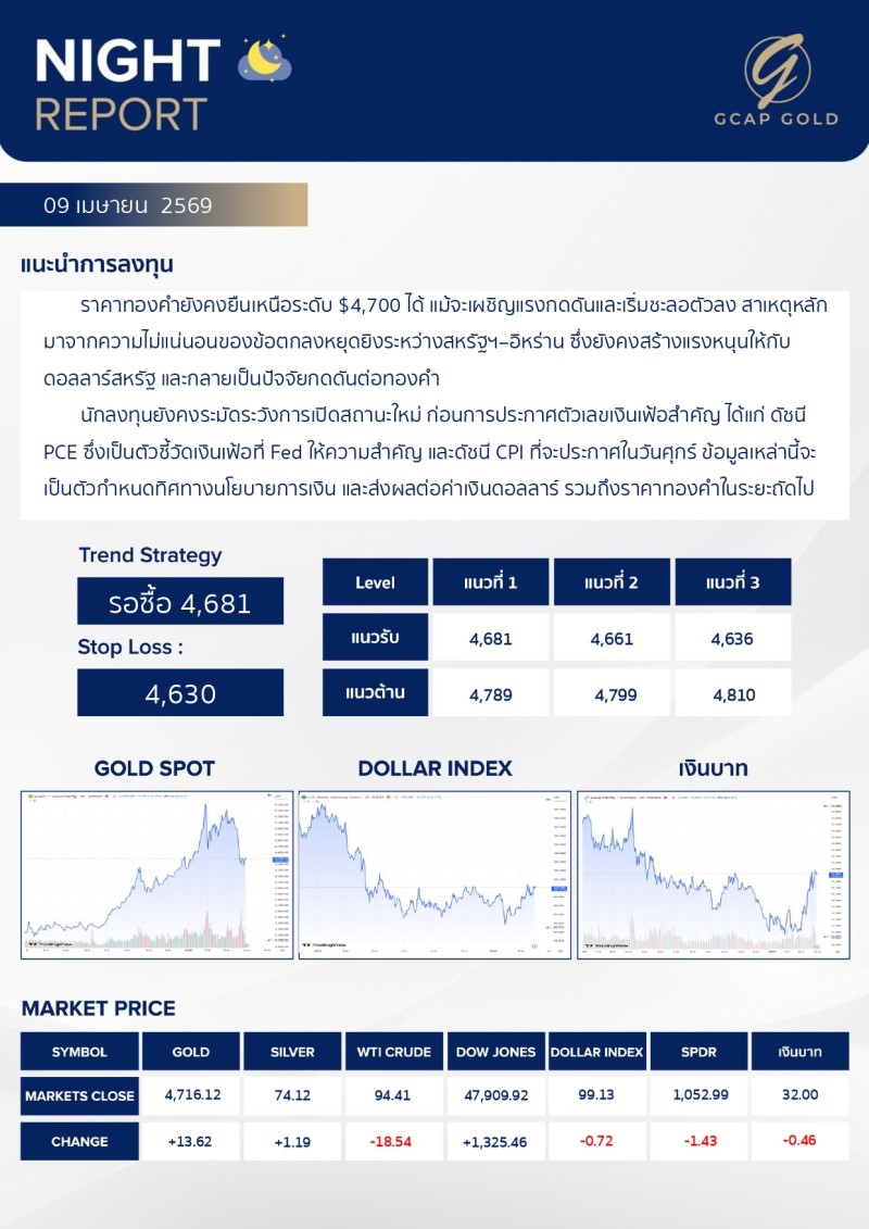 เเนะนำการลงทุนด้านทองคำ รอบเย็นวันนี้ 9 เมษายน 2569 โดย บริษัท จีแคป จำกัด ราคาทองคำยังคงยืนเหนือระดับ $4,700 ได้ แม้จะเผชิญแรงกดดันและเริ่มชะลอตัวลง สาเหตุหลักมาจากความไม่แน่นอนของข้อตกลงหยุดยิงระหว่างสหรัฐฯ-อิหร่าน ซึ่งยังคงสร้างแรงหนุนให้กับดอลลาร์สหรัฐ และกลายเป็นปัจจัยกดดันต่อทองคำ