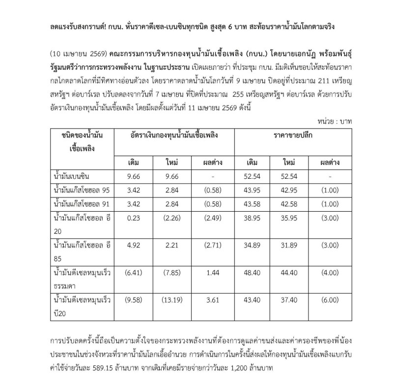 กบน. ปรับลดราคาน้ำมันขายปลีกทั้งกลุ่มเบนซิน-ดีเซล สะท้อนกลไกตลาดโลกที่ปรับตัวลดลง มีผล 11 เม.ย. 69