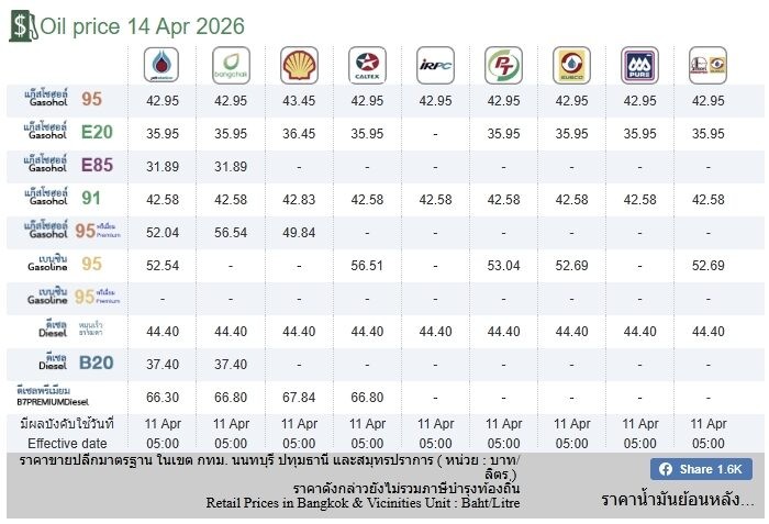 ดีเซล B20 : 37.40 บาท/ลิตร