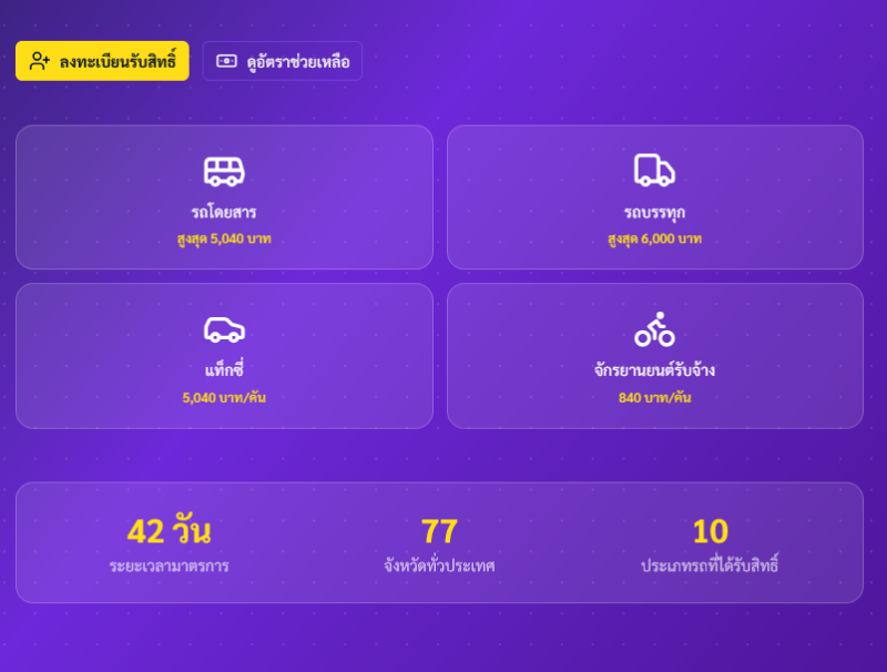 นายสรพงศ์ ไพฑูรย์พงษ์ อธิบดีกรมการขนส่งทางบก เปิดเผยว่า ได้กำหนดหลักเกณฑ์การช่วยเหลือครอบคลุมผู้ประกอบการขนส่งหลายประเภท ได้แก่ รถโดยสารสาธารณะ รถบรรทุกสินค้า รถแท็กซี่ และรถจักรยานยนต์รับจ้าง เพื่อบรรเทาผลกระทบจากต้นทุนเชื้อเพลิงที่เพิ่มขึ้น โดยมาตรการนี้จะมีผลตั้งแต่วันที่ 20 เมษายน ถึง 31 พฤษภาคม 2569 รวมระยะเวลา 42 วัน และจะจ่ายเงินช่วยเหลือภายหลังจากการตรวจสอบข้อมูลครบถ้วน