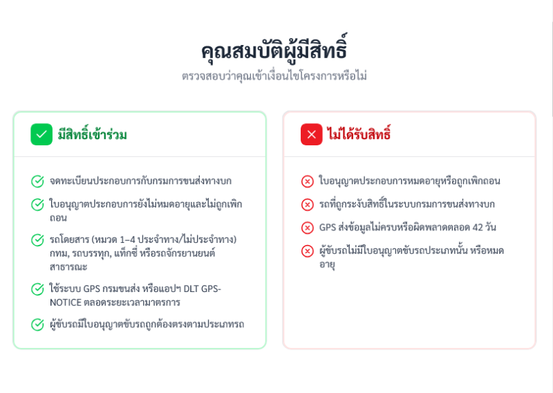 ผู้ประกอบการต้องให้บริการจริงในช่วงระยะเวลามาตรการ พร้อมมีข้อมูลการเดินรถผ่านระบบ GPS หรือแอปพลิเคชันที่กรมการขนส่งทางบกกำหนด ผู้ขับขี่ต้องยืนยันตัวตนอย่างถูกต้อง และห้ามบิดเบือนข้อมูล หากตรวจพบจะถูกตัดสิทธิ์และอาจถูกดำเนินคดีตามกฎหมาย