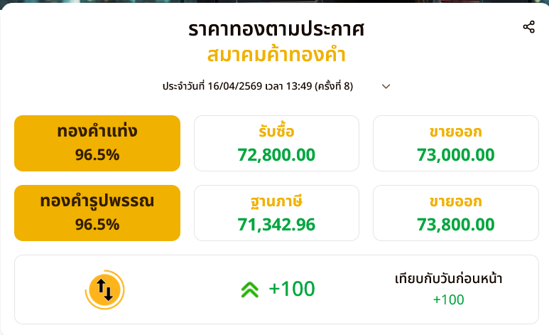 ราคาทองคำตลาดบ่ายวันนี้ 16 เมษายน 2569 โดยสมาคมค้าทองคำค้าทองคำ ประกาศราคาทองครั้งที่ 8 เวลา 13.49 น. ปรับขึ้น 100 ส่งผลให้ราคาทอง่าสุดอยู่ที่