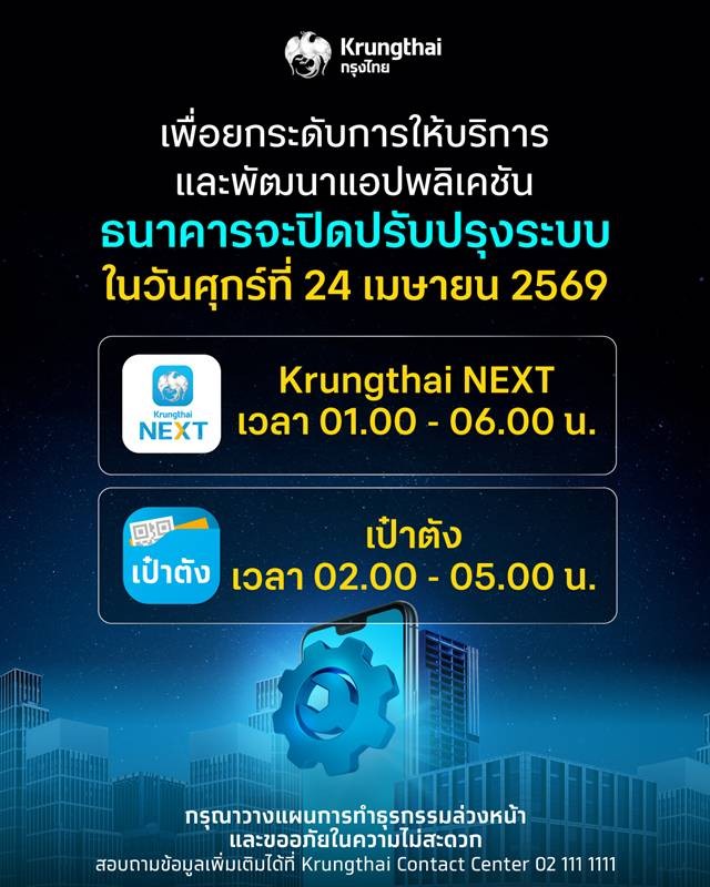 วันที่ 18 เมษายน 2569 เฟซบุ๊ก Krungthai Care มีการโพสต์ว่า เพื่อยกระดับการให้บริการธนาคารจะปิดปรับปรุงเพื่อพัฒนาระบบแอปฯ Krungthai NEXT ในวันศุกร์ ที่ 24 เมษายน 2569 เวลา 01.00 - 06.00 น.