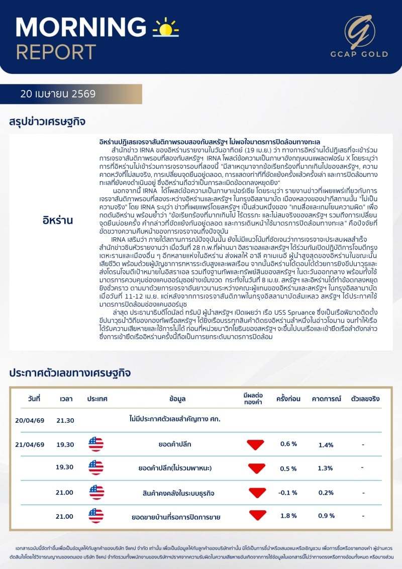 เเนะนำการลงทุนด้านทองคำ รอบเช้าวันนี้ 20 เมษายน 2569 โดย บริษัท จีแคป จำกัด ราคาทองคำร่วงลงต่ำกว่า 4,800 ดอลลาร์ ท่ามกลางความตึงเครียดในช่องแคบออร์มุซที่กลับมาอีกครั้ง นักลงทุนกำลังประเมินสถานการณ์ความตึงเครียดระหว่างสหรัฐฯ และอิหร่านที่กลับมาปะทุอีกครั้ง เกี่ยวกับช่องแคบฮอร์มุซ
