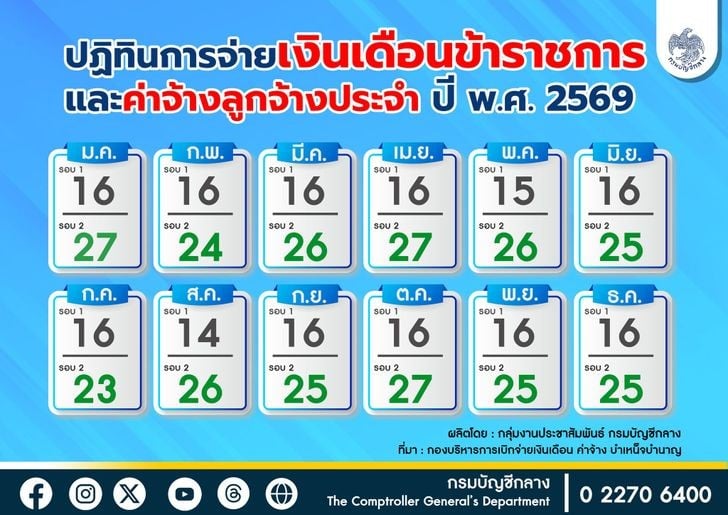 กระทรวงการคลังได้อัปเดตกำหนดการจ่ายเงินเดือนสำหรับข้าราชการ ลูกจ้างประจำ และข้าราชการบำนาญ รวมถึงทหารกองประจำการ ประจำเดือนเมษายน 2569 เพื่อให้บุคลากรภาครัฐได้วางแผนการใช้จ่ายได้อย่างเหมาะสม
