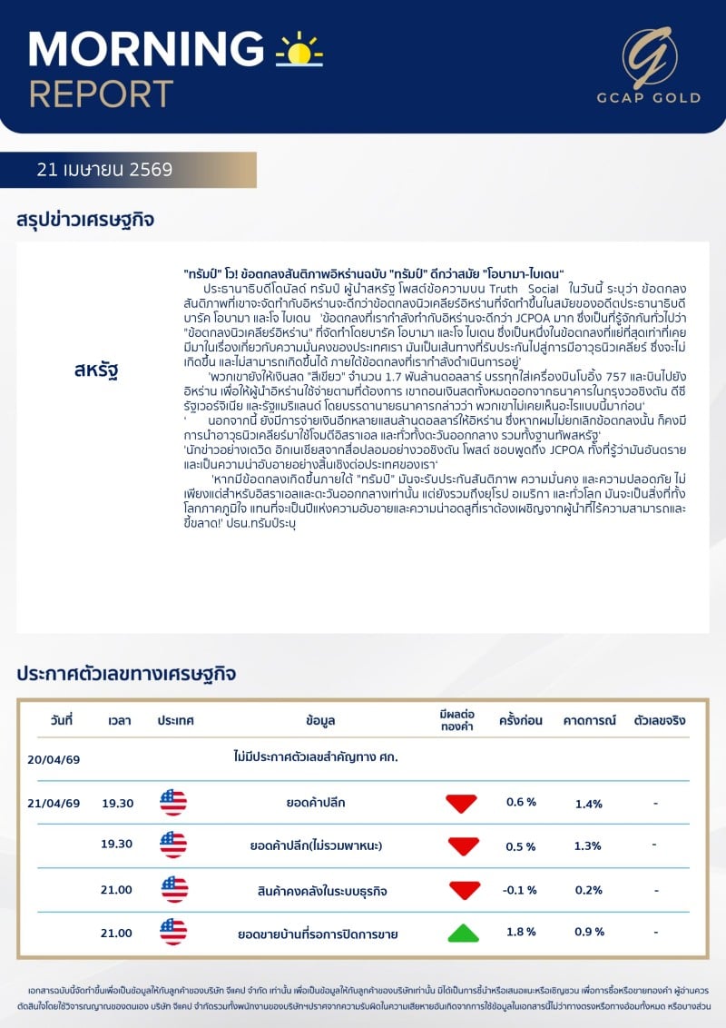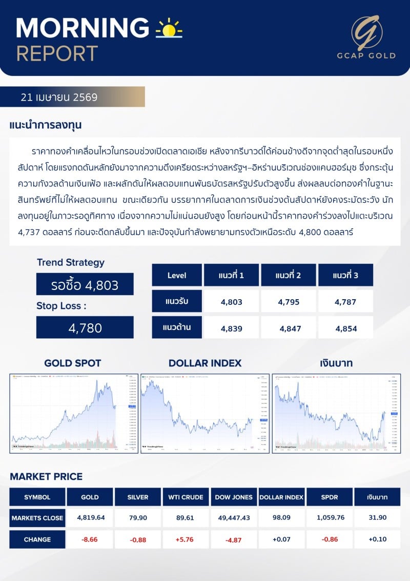 เเนะนำการลงทุนด้านทองคำ รอบเช้าวันนี้ 21 เมษายน 2569 โดย บริษัท จีแคป จำกัด ราคาทองคำเคลื่อนไหวในกรอบช่วงเปิดตลาดเอเชีย หลังจากรีบาวด์ได้ค่อนข้างดีจากจุดต่ำสุดในรอบหนึ่งสัปดาห์ โดยแรงกดดันหลักยังมาจากความถึงเครียดระหว่างสหรัฐฯ-อิหร่าน บริเวณช่องแคบออร์มุช ซึ่งกระตุ้นความกังวลด้านเงินเฟ้อ และผลักดันให้ผลตอบแทนพันธบัตรสหรัฐปรับตัวสูงขึ้น ส่งผลลบต่อทองคำในฐานะสินทรัพย์ที่ไม่ให้ผลตอบแทน