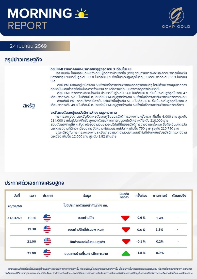 เเนะนำการลงทุนด้านทองคำ รอบเช้าวันนี้ 24 เมษายน 2569 โดย บริษัท จีแคป จำกัด ราคาทองคำปรับตัวลดลงต่ำกว่า $4,700 ในช่วงเปิดตลาดเอเชีย โดยแรงกดดันหลักมาจากการแข็งค่าของดอลลาร์สหรัฐควบคู่กับการปรับตัวขึ้นของราคาน้ำมัน ซึ่งยิ่งกระตุ้นความกังวลด้านเงินเฟ้อและส่งผลให้ภาพรวมตลาดเอนเอียงไปทางนโยบายการเงินที่ตึงตัวมากขึ้น