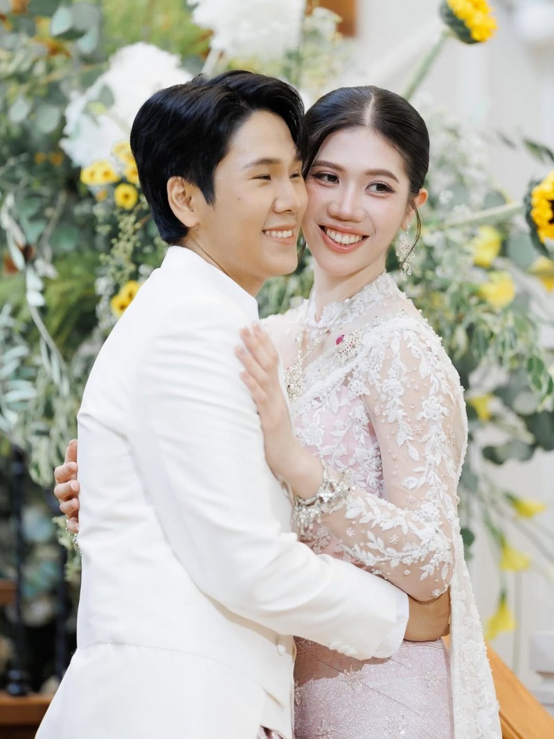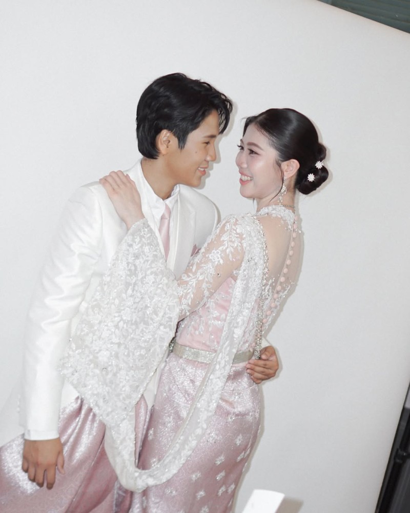 ชุดที่ 1 ชุดพิธีช่วงเช้า เจ้าสาวปรากฏตัวในลุคสวยสะกด มาในชุด ไทยประยุกต์โทนสีขาว–ชมพูกะปิ ที่ออกแบบมาอย่างประณีตปักดิ้นสีเงิน ชุดใช้ผ้าลูกไม้ปักลวดลายดอกไม้และใบไม้ละเอียดอ่อน คอเสื้อเป็นทรงตั้ง เพิ่มความสง่างาม ผ้าถุงจับจีบหน้านางเข้ารูปปักด้วยลายละเมียดละไม ตัดกับ สไบยาว