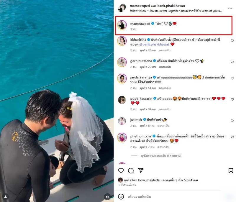 โมเมนต์สุดซึ้งนี้ทำเอาว่าที่เจ้าสาวคนสวยกลั้นน้ำตาไว้ไม่อยู่ และได้ออกมาโพสต์คลิปความประทับใจให้แฟน ๆ ได้ชมกันผ่านทางอินสตาแกรมส่วนตัว พร้อมแคปชั่นสั้น ๆ ว่า Yes