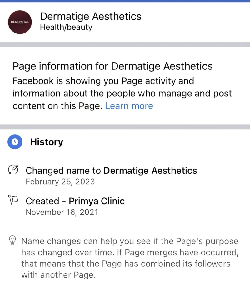 - ก.พ. 2023 Facebook Primya Clinic เปลี่ยนชื่อเป็น Dermatige Clinic รวมถึงช่องทางโซเชียล และไลน์ลูกค้าทั้งหมดของ Primya Clinic (รูปในเมนท์ 1) ประเด็นนี้ มีเรื่องพูดจาไม่ตรงกัน