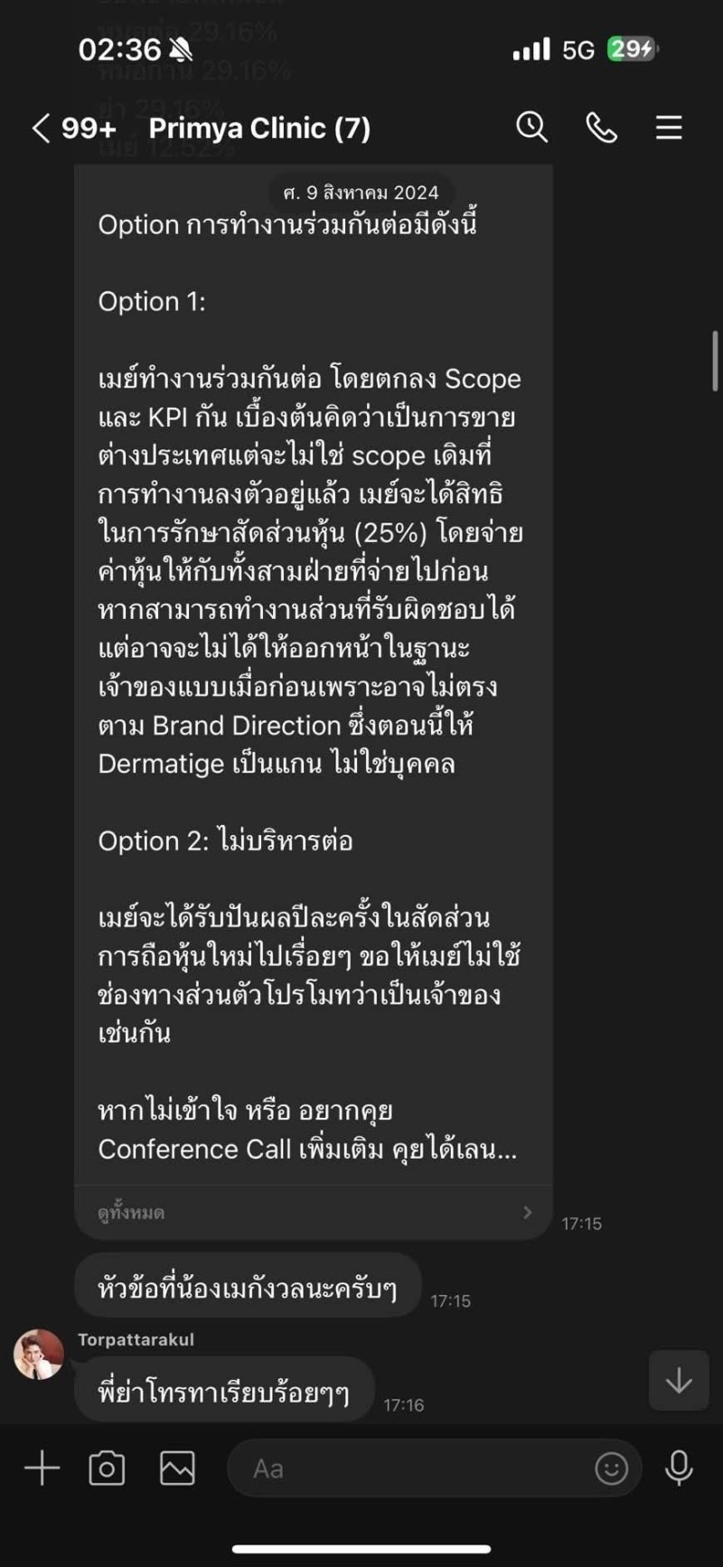 - ส.ค. 2024 ปรากฏแชทไลน์ ในการตกลงกันว่าจะโอนหุ้นคืนเมโดยการให้นอมินีมาถือหุ้นอย่างไรเท่าไหร่ โดยในกลุ่มนั้นปรากฏแชทไลน์ของหมอทั้งสองด้วย โดยเป็นการยื่นข้อเสนอให้ถือหุ้น 25% แต่จะไม่ได้หุ้นในสาขาใหม่ แต่ไม่ได้มีการตกลงกันเกี่ยวกับเครื่องหมายการค้า Dermatige (รูปในเมนท์4)