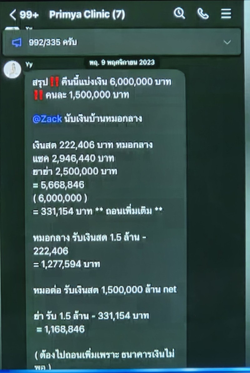 - พ.ย. 2023 ยังปรากฏเอกสาร แชท line ที่มีการแบ่งเงินปันผลกัน 6 ล้านบาท ที่เมย์เอามาเปิดโชว์ในโหนกระแสและทนายพยายามจะเกี่ยวโยงไปว่าเป็นแชทปลอมหรือไม่ (รูปในเมนท์2)