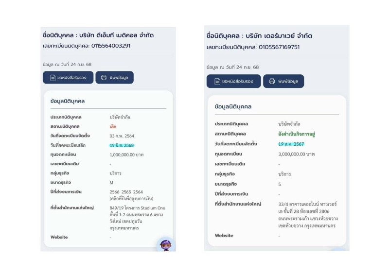 - ส.ค. 2024 ปรากฏ ญาญ่าหมอต่อหมอกลางเปิดบริษัทใหม่ชื่อ Dermaway ซึ่งเป็นบริษัทที่ลูกค้าสาขาใหม่โอนเงินเข้า ซึ่งบริษัทนี้ไม่มีเมหุ้น (รูปในเมนท์5)