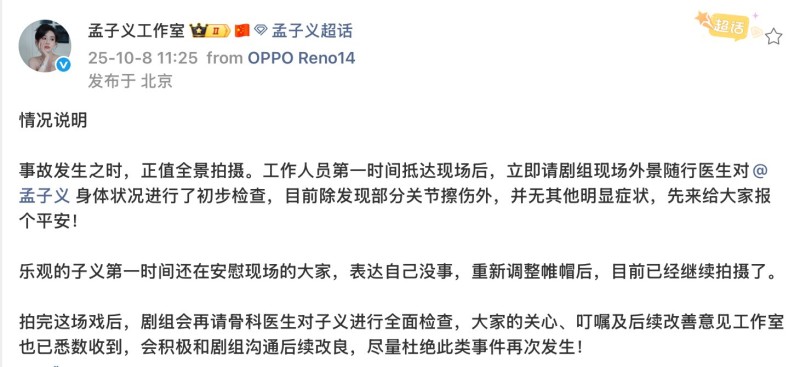 หลังจากที่เมิ่งจื่ออี้ล้มลง นักแสดงชายที่ร่วมฉากด้วยและทีมงานก็รีบเข้ามาช่วยเหลือเธอในทันทีค่ะ ในขณะที่ทางสตูดิโอของเธอก็ได้ออกมาโพสต์แจ้งว่าหลังเกิดเหตุ ว่าทีมงานได้ขอให้แพทย์ประจำสถานที่ทำการตรวจร่างกายเบื้องต้น นอกจากรอยถลอกที่ข้อต่อแล้ว ก็ไม่พบอาการอื่นๆที่แน่ชัด จึงได้มาชี้แจงเพื่อให้ทุกคนทราบว่าเธอปลอดภัยดีนั่นเอง ซึ่งหลังจากที่มีมีการแก้ไข ปรับผ้าคลุมหน้าของเธอก็ได้ดำเนินการถ่ายทำกันต่อ แต่หลังจากถ่ายทำฉากนี้เสร็จ ทีมงานจะให้ศัลยแพทย์กระดูกและข้อ ทำการตรวจเมิ่งจื่ออี้ อย่างละเอียดอีกที ซึ่งทางทีมงานก็รับคำเสนอแนะขอบทุกๆคนไปปรับปรุงต่อไป และจะไม่ให้เกิดเหตุการแบบนี้ขึ้นอีก