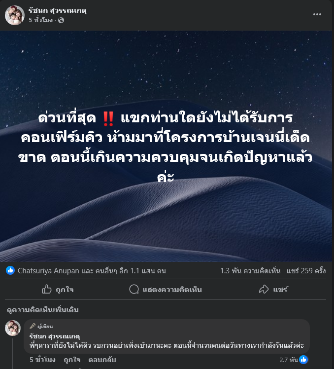 ล่าสุดเหมือนจะเกิดปัญหาแล้ว โดยสาวเจนนี่ได้โพสต์ข้อความระบุว่า ด่วนที่สุด แขกท่านใดยังไม่ได้รับการคอนเฟิร์มคิว ห้ามมาที่โครงการบ้านเจนนี่เด็ดขาด ตอนนี้เกินความควบคุมจนเกิดปัญหาแล้วค่ะ