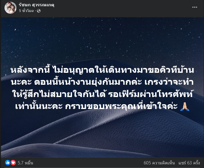 หลังจากนี้ ไม่อนุญาตให้เดินทางมาขอคิวทีบ้านนะคะ ตอนนี้หน้างานยุ่งกันมากค่ะ เกรงว่าจะทำให้รู้สึกไม่สบายใจกันได้ รอเฟิร์มผ่านโทรศัพท์เท่านั้นนะคะ กราบขอบพระคุณที่เข้าใจค่ะ