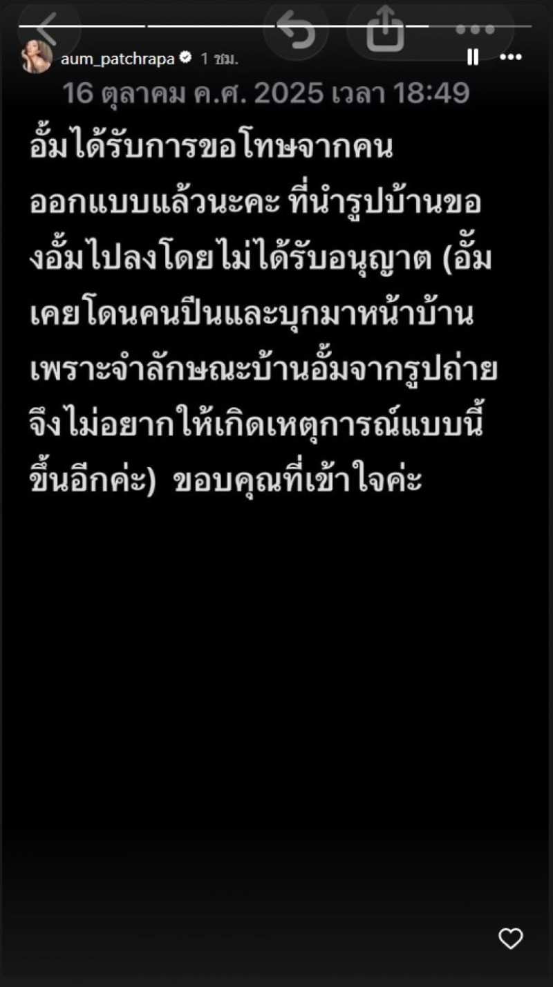 ล่าสุดอั้ม พัชราภา เคลื่อนไหวอีกครั้ง ว่าเธอได้รับการติดต่อขอโทษจากต้นโพสต์แล้ว พร้อมชี้แจงสาเหตุไม่โอเคหลังภาพบ้านถูกเผยแพร่ไป โดยระบุว่า อั้มได้รับการขอโทษจากคน ออกแบบแล้วนะคะ ที่นำรูปบ้านของอั้มไปลงโดยไม่ได้รับอนุญาต (อั้มเคยโดนคนปืนและบุกมาหน้าบ้าน เพราะจำลักษณะบ้านอั้มจากรูปถ่าย จึงไม่อยากให้เกิดเหตุการณ์แบบนี้ ขึ้นอีกค่ะ) ขอบคุณที่เข้าใจค่ะ