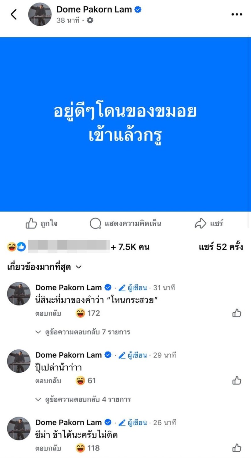 ล่าสุด โดม ปกรณ์ ลัม ก็ได้โพสต์ข้อความสุดจี๊ด โดยบอกว่า “อยู่ดีๆ โดนของขมอยเข้าแล้วกรู” ก่อนจะคอมเมนต์เพิ่มเติมใต้โพสต์แบบรัวๆ อาทิ นี่สินะที่มาของคำว่า “โหนกระสวย”, ปุ๊เปล่าน้าาาา, ซีม่า เข้าได้นะครับไม่ติด