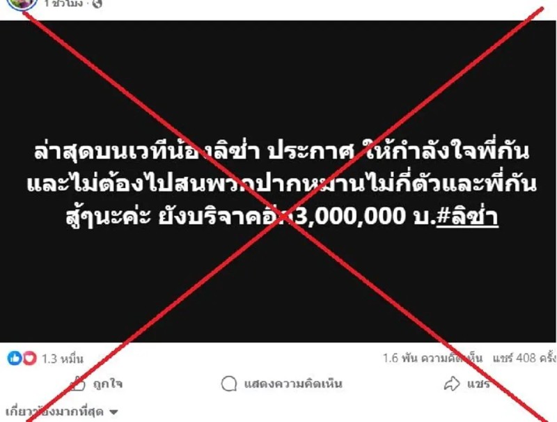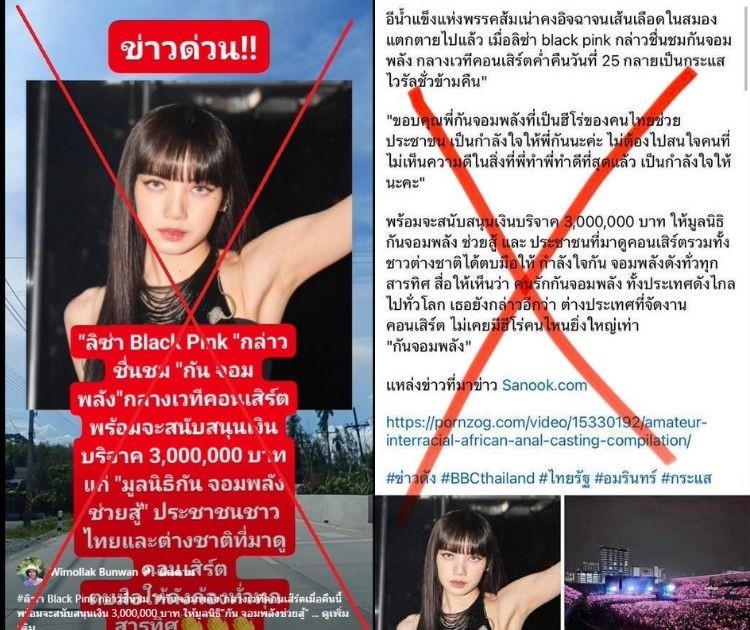 อย่างไรก็ตาม หลังจากมีการตรวจสอบข้อเท็จจริง พบว่าข้อมูลดังกล่าวไม่เป็นความจริง ลิซ่าไม่ได้กล่าวถ้อยคำดังกล่าวบนเวที และไม่ได้มีการประกาศหรือแสดงเจตนาบริจาคเงินตามที่โพสต์ระบุ