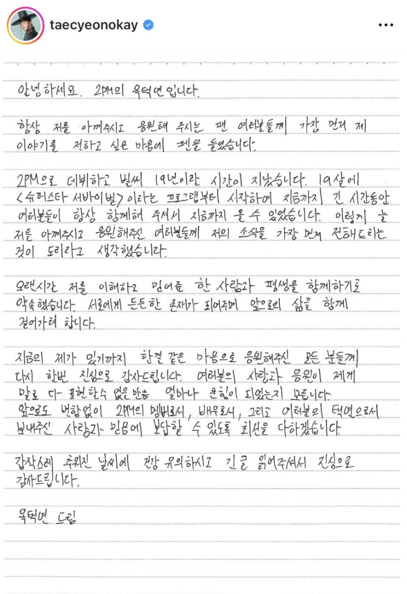 เรียกว่าสร้างความยินดีให้กับแฟน ๆ ทั่วโลก เมื่อ อค แทคยอน นักแสดงชื่อดัง และสมาชิกวง 2PM โพสต์จดหมายประกาศข่าวแต่งงาน ผ่านอินสตาแกรมส่วนตัว @taecyeonokay เมื่อวันที่ 1 พฤศจิกายน 2568 โดยจดหมายดังกล่าวเขียนด้วยลายมือของเจ้าตัว เพื่อบอกข่าวสำคัญให้แฟน ๆ ที่ติดตามและให้กำลังใจมาโดยตลอดได้รับรู้