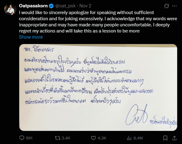 โดยหนึ่งในประโยคที่ถูกพูดถึงคือคำว่า ช่วงกอบโกย ซึ่งหลายคนมองว่าเป็นการสื่อถึงการ หากินกับกระแสวาย และอีกคำว่า หมาติดเป้ง ทำให้เกิดกระแสวิพากษ์วิจารณ์อย่างกว้างขวางในโลกออนไลน์ ล่าสุด โอ๊ตได้ออกมาโพสต์แถลงการณ์ขอโทษด้วยลายมือของตัวเอง ผ่านทางบัญชี X oat_psk โดยยอมรับว่าคำพูดดังกล่าวไม่เหมาะสม และจะนำเหตุการณ์นี้มาเป็นบทเรียนสำคัญในชีวิต