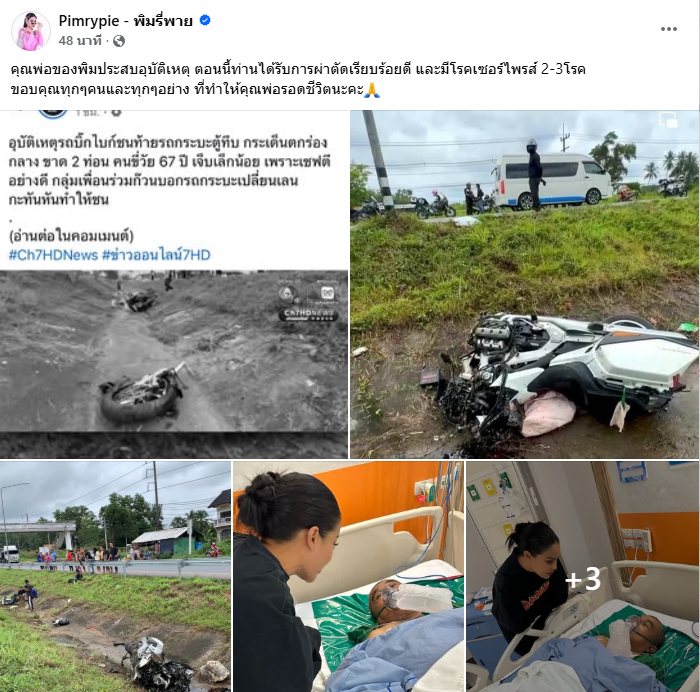 ล่าสุด วันนี้ 5 พฤศจิกายน 2568 เพจเฟซบุ๊ก Pimrypie - พิมรี่พาย ได้ออกมาโพสต์อัปเดตว่า ผู้บาดเจ็บในเหตุการณ์คือคุณพ่อของพิมรี่พาย โดยระบุว่า คุณพ่อของพิมประสบอุบัติเหตุ ตอนนี้ท่านได้รับการผ่าตัดเรียบร้อยดี และมีโรคเซอร์ไพรส์ 2-3 โรค ขอบคุณทุกๆ คนและทุกๆ อย่าง ที่ทำให้คุณพ่อรอดชีวิตนะคะ