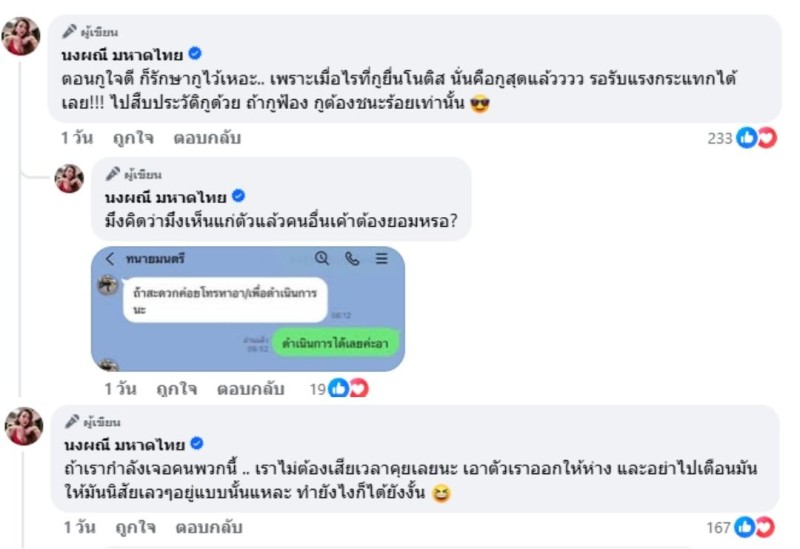 นอกจากนี้เจ้าตัวยังได้คอมเมนต์เพิ่มเติมใต้โพสต์ว่า ตอนกูใจดี ก็รักษากูไว้เหอะ เพราะเมื่อไรที่กูยื่นโนติส นั่นคือกูสุดแล้ว รอรับแรงกระแทกได้เลย! ไปสืบประวัติกูด้วย ถ้ากูฟ้อง กูต้องชนะร้อยเท่านั้น
