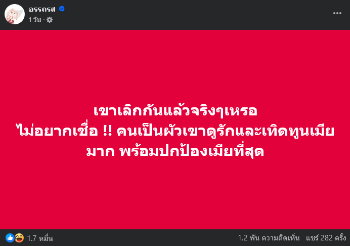 เรียกได้ว่ายังคงถูกจับตามองอย่างต่อเนื่อง สำหรับความสัมพันธ์ของคู่รักคนดัง แม่ตั๊ก และ ป๋าเบียร์ หลังเพจข่าวบันเทิงชื่อดัง อรรถรส ปล่อยประเด็นชวนให้ใส่ใจ พร้อมข้อความโดยระบุว่า เขาเลิกกันแล้วจริงเหรอ ไม่อยากเชื่อ คนเป็นผัวดูรักและเทิดทูนเมียมาก พร้อมปกป้องเมียที่สุด ซึ่งภายหลังโพสต์ดังกล่าวได้ถูกเผยเเพร่ออกไป งานนี้ทำเอาชาวเน็ตเริ่มสงสัยว่าเป็นคู่ของใครกัน