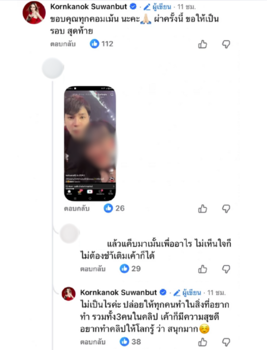 งานนี้แม่ตั๊กไม่ขอทน เข้ามาตอบคอมเมนต์สั้น ๆ แต่ชัดเจนว่า ไม่เป็นไรค่ะ ปล่อยให้ทุกคนทำในสิ่งที่อยากทำ รวมทั้ง 3 คนในคลิป เขาก็มีความสุขดี อยากทำคลิปให้โลกรู้ว่า สนุกมาก ซึ่งคำตอบดังกล่าวยิ่งทำให้หลายคนสงสัยต่อว่าอาจเกิดปัญหาบางอย่างในความสัมพันธ์ของทั้งคู่จริงหรือไม่