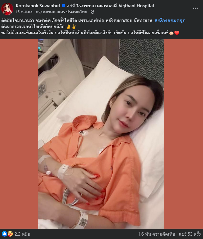 ล่าสุด ด้านแม่ตั๊ก ก็เพิ่งโพสต์ภาพตัวเองนอนพักฟื้นในโรงพยาบาลพร้อมข้อความ ผ่านเฟซบุ๊กส่วนตัว Kornkanok Suwanbut โดยระบุว่า ตัดสินใจมานานว่า จะผ่าตัด อีกครั้งในชีวิต เพราะเอฟเฟค หลังดมยาสลบ มันทรมาน เนื้องอกมดลูก ดันมาตรวจเจอหัวใจเต้นผิดปกติอีก ขอให้ตัวเองแข็งแรงในเร็ววัน ขอให้ปีหน้าเป็นปีที่จะมีแต่สิ่งดี ๆ เกิดขึ้น ขอให้มีชีวิตอยู่เพื่อเคธี่