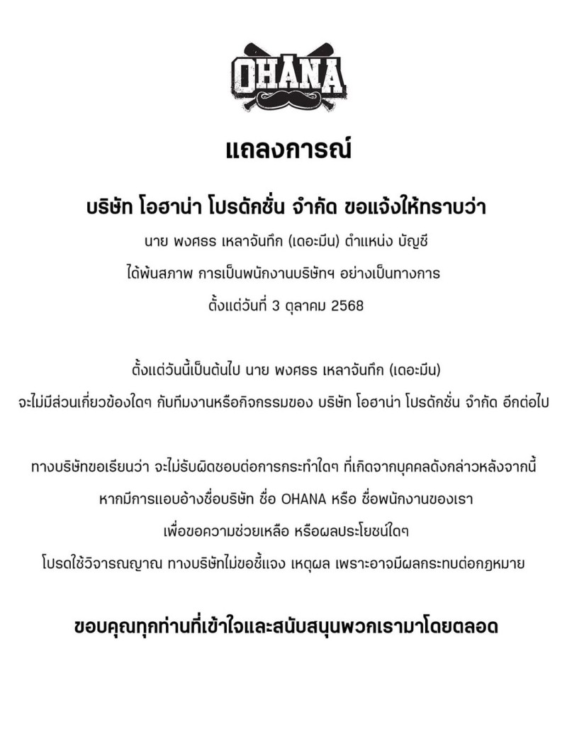 ล่าสุดวันที่ 19 พฤศจิกายน 2568 อาร์ม OHANA ได้โพสต์ นิทานเรื่องที่สอง ซึ่งหลายคนเชื่อว่ามีการสื่อถึงความขัดแย้งที่เกิดขึ้นในทีม โดยอาร์มเล่าเปรียบเทียบว่า อีกาตัวหนึ่งมาแอบขโมยกินผลไม้ในบ้านผมอยู่บ่อยๆ นานหลายปี ผมปล่อยให้กินโดยที่ไม่ว่าอะไร ผมแอบส่งเสียงไล่นิดหน่อยในบางครั้ง เพื่อหวังว่าวันนึงอีกาตัวนั้นจะหยุดขโมยกิน แต่มันดันไม่หยุด
