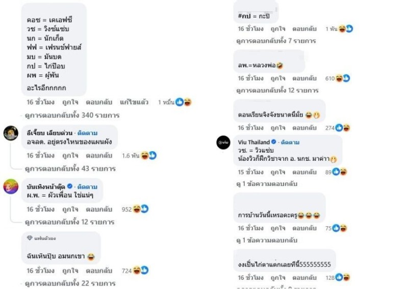 มีผู้ติดตามทายอักษรย่อออกมาแบบเมนูไก่ทอดดังครบทุกชนิด ทั้งคอซ = เคเอฟซี, วซ = วิงซ์แซ่บ, นก = นักเก็ต, ฟฟ = เฟรนช์ฟายส์, มบ = มันบด, กป = ไก่ป๊อบ, ผพ = ผู้พัน และยังมีการแซวเพิ่มเติมว่า กป = กะปิ, ลพ.=หลวงพ่อ, ตอนเรียนจริงจังขนาดนี้มั้ย, การบ้านวันนี้เหรอคะครู, งงเป็นไก่ตาแตกเลยทีนี้ และจากที่แค่สงสัย ตอนนี้กลายเป็นงงไปเลย