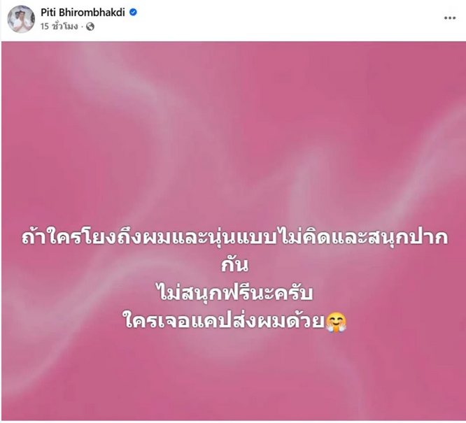เรียกว่าโยงกันมั่วแบบไม่ยั้งเลยทีเดียว ล่าสุด ต๊อด ปิติ ออกมาเคลื่อนไหว ผ่านเฟซบุ๊กส่วนตัว ระบุว่า ถ้าใครโยงถึงผมและนุ่นแบบไม่คิดและสนุกปากกัน ไม่สนุกฟรีนะครับ ใครเจอแคปส่งผมด้วย