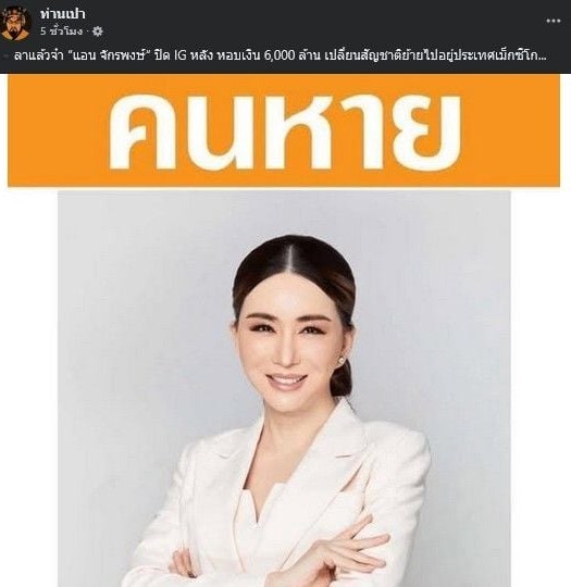 ล่าสุด โลกโซเชียลเกิดกระแสวิพากษ์หนัก เมื่อพบว่าบัญชีอินสตาแกรมส่วนตัวของ แอน จักรพงษ์ ถูกตั้งค่าเป็นบัญชีส่วนตัวแล้ว ขณะเดียวกัน เพจ ท่านเปา ได้นำภาพของเธอไปทำเป็นโปสเตอร์ประกาศตามหาคนหาย พร้อมข้อความว่า คนหาย และข้อความที่ระบุว่า ลาแล้วจ้า แอน จักรพงษ์ ปิด IG หลัง หอบเงิน 6,000 ล้าน เปลี่ยนสัญชาติย้ายไปอยู่ประเทศเม็กซิโก