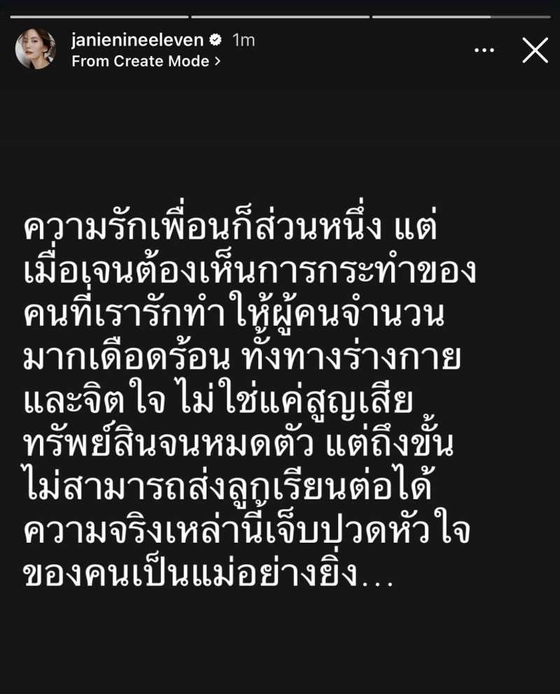 ล่าสุดโพสต์ในสตอรี่ไอจีเพิ่มเติม ระบุว่า ความรักเพื่อนก็ส่วนหนึ่ง แต่เมื่อเจนต้องเห็นการกระทำของคนที่เรารักทำให้ผู้คนจำนวนมากเดือดร้อน ทั้งทางร่างกายและจิตใจ ไม่ใช่แค่สูญเสียทรัพย์สินจนหมดตัว แต่ถึงขั้นไม่สามารถส่งลูกเรียนต่อได้ ความจริงเหล่านี้เจ็บปวดหัวใจของคนเป็นแม่อย่างยิ่ง