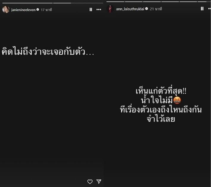 วันที่ 24 พฤศจิกายน 2568 จากกรณีก่อนหน้านี้ เจนนี่ เทียนโพธิ์สุวรรณ ได้โพสต์สตอรี่ไอจี พร้อมระบุว่า คิดไม่ถึงว่าจะเจอกับตัว ขณะที่แอนเขียนข้อความว่า เห็นแก่ตัวที่สุด น้ำใจไม่มี ทีเรื่องตัวเองถึงไหนถึงกัน จำไว้เลย พร้อมอิโมจิโกรธประกอบ