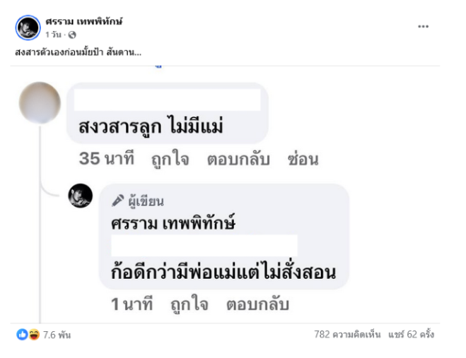 นอกจากนี้ หนุ่ม ศรราม ยังได้แคปคอมเมนต์ดังกล่าวมาโพสต์ในเฟซบุ๊กส่วนตัว ศรราม เทพพิทักษ์ พร้อมระบุแคปชั่นเพิ่มเติมว่า สงสารตัวเองก่อนมั้ยป้า สันดาน