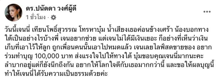 โดยที่บุ๋มได้โพสต์ข้อความไว้ว่า วันนี้เจนี่ เทียนโพธิ์สุวรรณ โทรหาบุ๋ม น้ำเสียงเธอค่อนข้างเศร้า น้องบอกทางใต้เป็นอย่างไรบ้างพี่ เจนอยากช่วย แต่เจนไม่ได้มีเงินเยอะ ก็อย่างที่เห็นว่าเงินเก็บที่เอาไว้ให้ลูก ถูกเพื่อนคนนั้นเอาไปหมดแล้ว