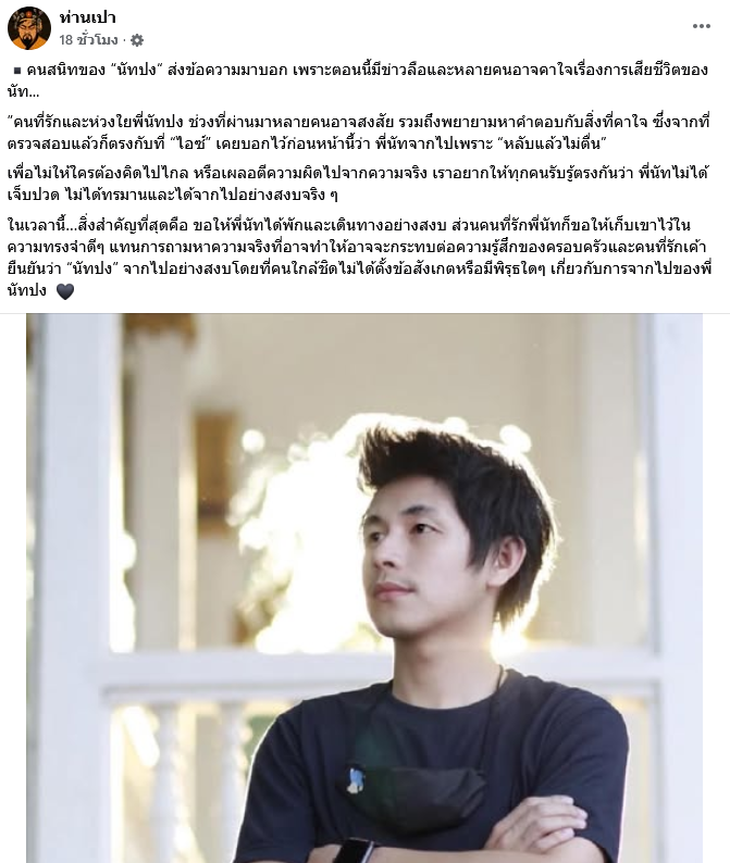ในเวลานี้ สิ่งสำคัญที่สุด คือ ขอให้พี่นัทได้พักและเดินทางอย่างสงบ ส่วนคนที่รักพี่นัทก็ขอให้เก็บเขาไว้ในความทรงจำดีๆ แทนการถามหาความจริงที่อาจทำให้อาจจะกระทบต่อความรู้สึกของครอบครัวและคนที่รักเค้า ยืนยันว่า นัทปง จากไปอย่างสงบโดยที่คนใกล้ชิดไม่ได้ตั้งข้อสังเกตหรือมีพิรุธใด ๆ เกี่ยวกับการจากไปของพี่นัทปง