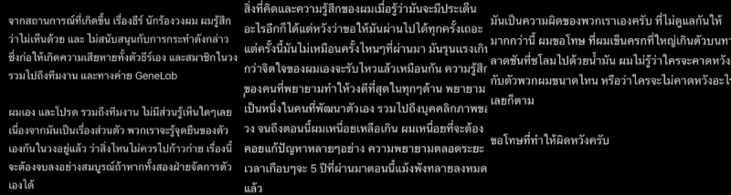 เฟรมระบุว่า จากสถานการณ์ที่เกิดขึ้น เรื่องธีร์ นักร้องวงผม ผมรู้สึกว่าไม่เห็นด้วย และ ไม่สนับสนุนกับการกระทำดังกล่าว ซึ่งก่อให้เกิดความเสียหายทั้งตัวธีร์เอง และสมาชิกในวง รวมไปถึงทีมงาน และทางค่าย GeneLab