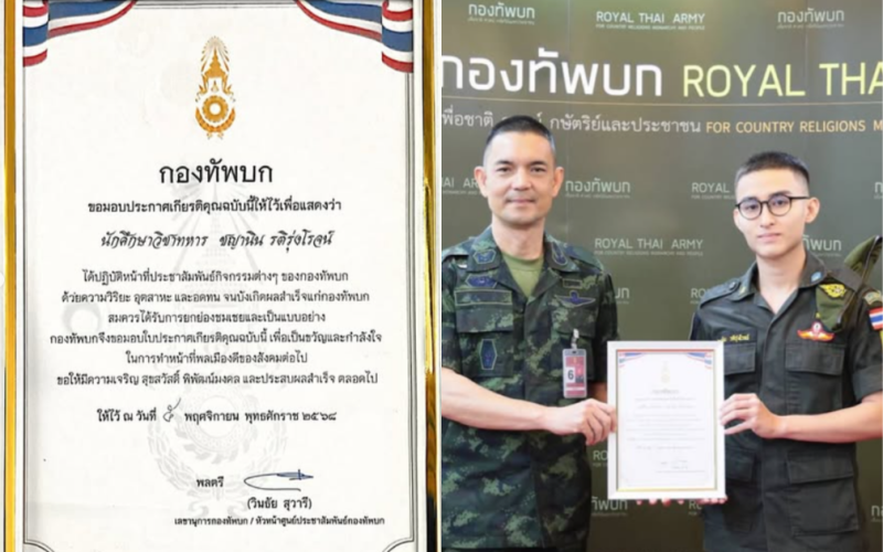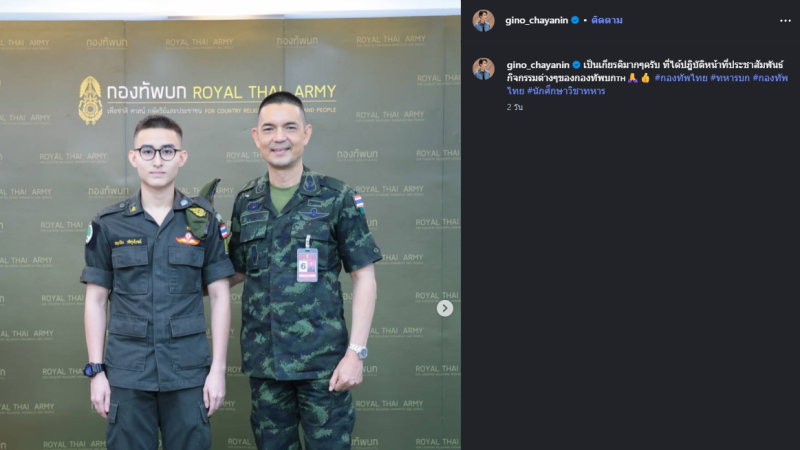 ภาพล่าสุดที่เจ้าตัวโพสต์เผยให้เห็นโมเมนต์ระหว่างร่วมภารกิจกับกองทัพบกในหน้าที่ประชาสัมพันธ์กิจกรรมต่างๆ พร้อมข้อความว่า เป็นเกียรติมากๆ ครับ ที่ได้ปฏิบัติหน้าที่ประชาสัมพันธ์กิจกรรมต่างๆ ของกองทัพบก